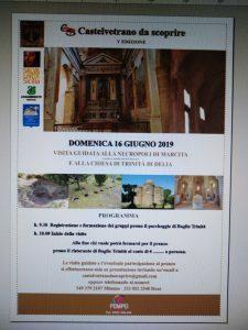 Domenica 16 Giugno 2019 il percorso artistico-culturale organizzato dal gruppo "Castelvetrano da scoprire" in collaborazione con il circolo Crimiso di Legambiente e la proloco CastelvetranoSelinunte farà tappa alla chiesa di SS. Trinità di Delia ed alla vicina necropoli preistorica di Marcita; l'appuntamento è per le ore 9,30 presso il parcheggio di Baglio Trinità per la registrazione dei partecipanti che dovranno presentare idonea liberatoria scaricabile dalla pagina facebook del gruppo ( o sottoscrivere in loco); si consiglia abbigliamento e scarpe comode comunque adeguati al tipo di evento ; all'atto della registrazione verrà consegnato un pieghevole con brevi cenni sui due siti da visitare; le visite avranno la durata ciascuna di meno di due ore e si concluderanno entro le ore 13.30, per consentire a chi si ferma a pranzo di accedere per tempo al vicino ristorante; per partecipare alla visita guidata e/o al successivo pranzo ( menù fisso con prezzo di €.22) è necessario prenotarsi entro Giovedì 13 Giugno 2019 o inviando una e-mail a : castelvetranodascoprire@gmail.com oppure telefonando al n.3493792187 (Mimmo) o al n.3338522540 (Rosa).
