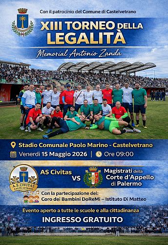 Lo sport come linguaggio universale di riscatto civile e dialogo con le nuove generazioni: torna il 15 maggio 2026, a partire dalle ore 09:00, l’appuntamento con il “XIII Torneo della Legalità – Memorial Antonio Zanda”. La manifestazione, organizzata dall’Associazione A.S. Civitas, si terrà presso lo Stadio Comunale “Paolo Marino” di Castelvetrano.
