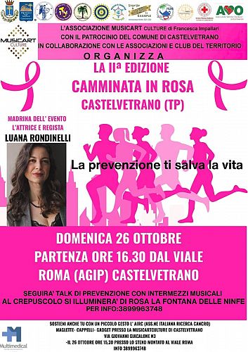 . A fine camminata ci riuniremo tutti al Sistema delle Piazze dove ci sarà un talk di prevenzione con intermezzi musicali a cura degli allievi della Musicartculture,Successivamente attenderemo il crepuscolo per l’illuminazione della fontana Della Ninfa che per tale occasione si tingerà di RosaData : 26 Ottobre 2025Luogo: Viale Roma (AGIP)Raduno: 16,30Partenza:17:00Arrivo al Sistema delle piazze ore 17,40 circaTalk prevenzione e interventi musicali fino al crepuscoloIlluminazione della Fontana della ninfa: al crepuscoloMagliette, cappellini e badge saranno disponibili presso la MUSICARTculture in via Giovanni Giacalone n3 CastelvetranoOppure presso uno Stand sito al Viale Roma il giorno stesso della manifestazione attivo dalle ore 15.30Parte del ricavato andrà a Sostegno della Ricerca Oncologica AIRCPer info contattare il 3899963748Si ringrazia: il Sindaco Giovanni Lentini, l’ Amministrazione Comunale, l’ Assessore Rosalia Ventimiglia , tutti i club service, associazioni e sponsor che hanno sostenuto l’ iniziativa: Rotary, Fidapa, Filds, Inner Wheel , Avo, Pro Loco, Palma Vitae, Croce Rossa, Multimedical, Calcestruzzi SRL Pagliarello
