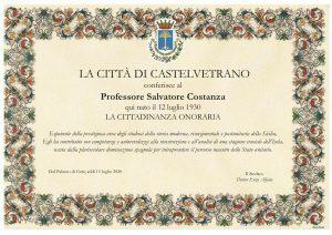 Il sindaco della città di Castelvetrano , Enzo Alfano ha deciso di far propria la proposta avanza dalla società Dante Alighieri di Castelvetrano ed ha conferito la cittadinanza onoraria al professor Salvatore Costanza. La consegna avverrà domani pomeriggio, mercoledì 15 luglio alle 17.30 al Teatro Selinus di Castelvetrano Castelvetranese di nascita ma trapanese d’azione dove risiede da molti anni è stato docente di Storia e di Ecostoria negli Istituti Superiori e Universitari, Salvatore Costanza ha dedicato alla Sicilia moderna e contemporanea il suo maggiore impegno di studioso con i libri sulla marginalità sociale (La Patria armata, 1989), sul Risorgimento (La libertà e la roba, 1998), sui Fasci Siciliani e il movimento contadino (L’utopia militante, 1996).