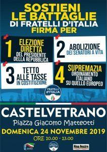 Domenica 24 novembre 2019, dalle ore 10.00 alle ore 13.00, presso la Piazza Giacomo Matteotti di Castelvetrano il Circolo locale di Fratelli d’Italia, unitamente ai Movimenti Riva Destra e Gioventù Nazionale, sarà impegnato nella campagna di raccolta firme a sostegno delle battaglie politiche che il partito e la leader Giorgia Meloni portano avanti sull’intero territorio nazionale: La raccolta firme avrà ad oggetto i seguenti temi: • elezione diretta del Presidente della Repubblica; • abolizione dei Senatori a vita; • stabilire nella Costituzione un limite alle tasse; • dare supremazia all’ordinamento italiano su quello europeo.
