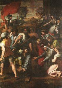 Sua la copia della “Caduta sulla via del Calvario” di Raffaello, che il castelleonese dipinse nel 1574. Il dipinto originale di Raffaello per la chiesa di Santa Maria dello Spasimo (da cui deriva anche il nome “Spasimo di Sicilia”) fu poi venduto a Filippo IV di Spagna, ora esposto al museo del Prado di Madrid. In fondo alla navata destra è stato posto, dopo gli infiniti restauri della chiesta post terremoto del Belìce, il ritratto della “Sacra Famiglia e santi” del 1573, proveniente dal palazzo vescovile di Mazara del Vallo.