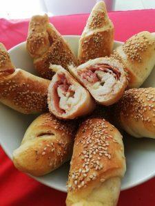 Semi di sesamo q.b. Il procedimento. Stesi i rotoli di pasta sfoglia, tagliare con un coltello la sfoglia a forma di triangolo isoscele. Posizionare il formaggio sulla base e le fette di prosciutto lungo i lati. Partendo dalla base, arrotolare il tutto e curvare le due estremità per conferirgli la classica forma del cornetto. Spennellare la superficie con il tuorlo d'uovo e spolverarla con i semi di sesamo. Infine, mettere in forno preriscaldato a 180 gradi per 10/15 minuti fino a cottura ultimata.