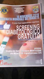 Su iniziativa del Presidente Avv. Vito Signorello, il Lions Club Castelvetrano, nella giornata mondiale del diabete, organizza un’attività di screening diabetologico gratuito Il diabete è una malattia cronica che può causare gravi danni al cuore, ai reni ed è la sesta causa di mortalità nel mondo. Il numero delle persone affette da questa malattia è in continua crescita ed è per questo che il Lions Club International sta affrontando questa emergenza sanitaria globale attraverso la realizzazione di iniziative indirizzate ad aumentare la sensibilizzazione sul tema del diabete e sull’importanza di un’efficacie prevenzione.”