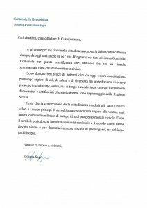 Conoscendo l’impossibilità della Senatrice a partecipare a cerimonie ufficiali, tanto più in questo particolare momento di pandemia da covid-19,  il Sindaco farà recapitare una pergamena in ricordo  di tale conferimento che verrà recapita presso il Senato della Repubblica. Questo invece il testo che la Senatrice a vita, Liliana Segre ha indirizzato al primo cittadino quale ringraziamento per il riconoscimento ricevuto: