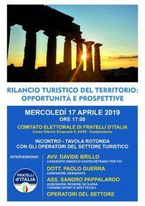 Domani pomeriggio, mercoledi’ 17 Aprile alle ore 17. 00 è prevista una tavola rotonda organizzata da Fratelli D’Italia dal tema “Rilancio Turistico del territorio: opportunità e prospettive”. Oltre al candidato sindaco Davide Brillo ed all’assessore designato Paolo Guerra sarà presente all’incontro che si terrà presso il comitato elettorale di Fratelli d’Italia sito nel corso Vittorio Emanuele II N.53, l’Assessore Regionale al Turismo Sport e Spettacolo, Sandro Pappalardo. Invitati alla manifestazione tutti gli interessati, unitamente agli operatori turistici del territorio.