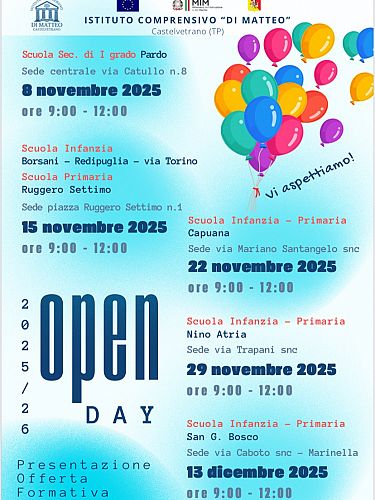 Anche quest’anno l’Istituto Comprensivo “Di Matteo” di Castelvetrano organizza una serie di Open Day per presentare l’offerta formativa e far conoscere da vicino i diversi plessi scolastici: scuole dell’infanzia, primarie e la scuola secondaria di I grado.