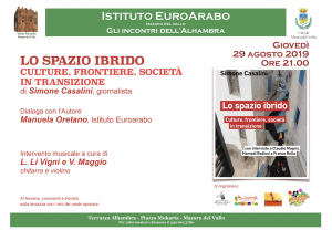 A dialogare con l’Autore e a coordinare l’incontro sarà Vincenzo Caracci Montalbano, dell’Istituto Euroarabo. Alla conversazione seguirà il momento musicale a cura dell’Eba Trio, chitarra, sax, contrabbasso. I vini saranno offerti dall’Azienda Giglio. Sponsor della serata la ditta Ciolla’s. Giovedì 29 agosto alle ore 21 sulla terrazza dell’Alhambra di Mazara sarà presentato il volume di Simone Casalini, Lo spazio ibrido. Culture, frontiere, società in transizione (Meltemi editore).