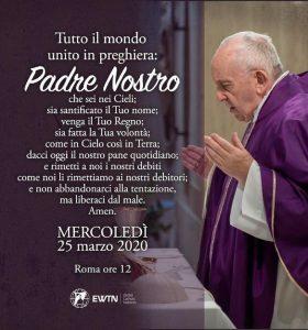 Questa mattina a mezzogiorno il Santo Padre reciterà il Padre Nostro, con i cristiani di tutte le confessioni. Invito - dice dalla Biblioteca del Palazzo Apostolico - tutti i Capi delle Chiese e i leader di tutte le Comunità cristiane, insieme a tutti i cristiani delle varie confessioni, a invocare l’Altissimo, Dio onnipotente, recitando contemporaneamente” il Padre Nostro, mercoledì 25 marzo a mezzogiorno, nel giorno in cui molti cristiani ricordano l’annuncio alla Vergine Maria dell’Incarnazione del Verbo: “Possa il Signore - afferma - ascoltare la preghiera unanime di tutti i suoi discepoli che si preparano a celebrare la vittoria di Cristo Risorto.