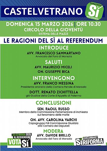 Si terrà a Castelvetrano domenica 15 marzo alle ore 10.30, presso il Circolo della Gioventù nel Sistema delle Piazze, un incontro pubblico dal titolo “Le ragioni del Sì al Referendum”, momento di confronto e approfondimento sui temi della giustizia e della riforma del sistema giudiziario.