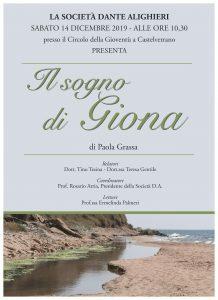 Sarà presentato sabato 14 dicembre 2019, alle ore 10:30, presso il salone del Circolo della Gioventù in Castelvetrano, l’ultimo libro di Paola Grassa, dal titolo “Il sogno di Giona”, impresso nel mese di ottobre scorso presso le Arti Grafiche Campo di Alcamo. Si tratta di un racconto nato d’impulso – come riferisce l’Autrice nella nota introduttiva – in una notte di tempesta. La scrittura diviene ancora una volta, per Paola Grassa, come già in passato, “scoglio salvifico” nei giorni dello sconforto.