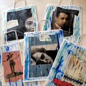 Collage, illustrazioni e segni grafici realizzati direttamente sui sacchetti o dipinti sulle pagine dei libri. Tutti pezzi unici. "Il progetto - ha dichiarato la grafica Martinico - è nato durante il lockdown. Visto il tanto tempo a disposizione, ho detto a Teresa che mi sarebbe piaciuto molto decorare dei sacchetti utilizzando delle pagine di vecchi libri ormai ingiallite o illustrazioni tratte dai cataloghi che le inviavano. Sono nate così le nostre "Graphic Bag" da incorniciare".