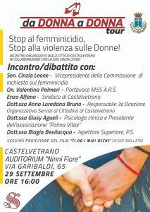 L’amministrazione comunale di Castelvetrano ha organizzato un incontro dibattito per parlare della problematica della violenza sulle donne. L’incontro si terrà Domenica 29 settembre alle ore 16.00, presso l’Auditorium “Ninni Fiore” in Via Garibaldi 65. Saranno presenti il sindaco Enzo Alfano, Loredana Bruno, responsabile della 3^ Direzione Organizzativa Servizi al Cittadino di Castelvetrano, Giusy Agueli, psicologa clinica e Presidente dell’associazione “Palma Vitae” , Biagia Bevilacqua, Ispettore superiore Polizia di Stato, la Senatrice Cinzia Leone, vicepresidente della Commissione di inchiesta sul femminicidio, e l’On.