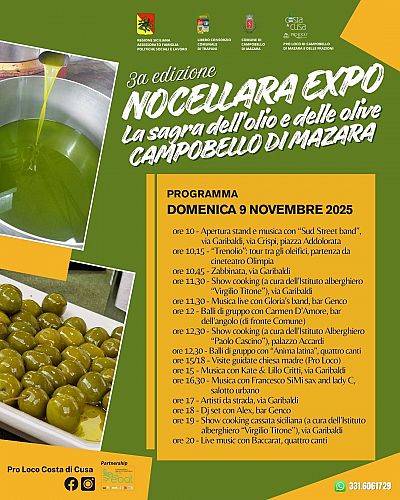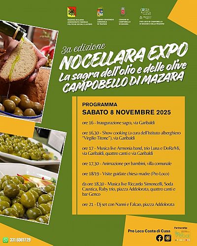 Dopo lo straordinario successo delle prime due edizioni, che hanno visto la presenza a Campobello di migliaia di visitatori provenienti da tutta la Sicilia, l’Amministrazione comunale promuove la 3ᵃ edizione della “NOCELLARA EXPO” - Sagra dell’Olio e dell’Oliva Nocellara del Belìce DOP, che si terrà sabato 8 e domenica 9 novembre, in via Garibaldi a Campobello di Mazara.