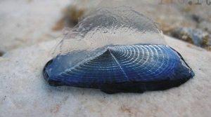 Si tratta di “Velella velella” (vedi foto 1), comunemente note come “Barchetta di San Pietro”. Sono degli organismi appartenenti allo stesso gruppo delle meduse (Cnidaria). Non sono urticanti per l’uomo. Questi organismi come le altre meduse, appartengono al plancton e come tale vengono inseriti nel contesto di altre forme di vita che non riescono con loro nuoto a contrastare la forza della corrente.