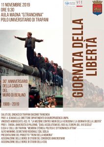 In occasione della “Giornata della Libertà” - istituita dal Coordinamento Nazionale Enti Locali per la Pace e Diritti Umani, per commemorare il 30^ anniversario della caduta del Muro di Berlino, il Comune di Trapani organizza un incontro di riflessione per lunedì 11 novembre, alle ore 9.30, presso l’Aula Magna del Polo Universitario di Trapani. All’incontro, rivolto agli studenti delle scuole superiori, interverranno il Sindaco Giacomo Tranchida e l’Assessore Abbruscato. Seguirà il prof.