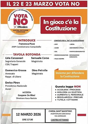 “Vota no per difendere giustizia, costituzione e democrazia”. E' il tema della tavola rotonda che il Comitato per il “no” al referendum costituzionale terrà domani, alle 17,30, all'auditorium comunale della Chiesa Sant'Agostino, in via Garibaldi a Castelvetrano.